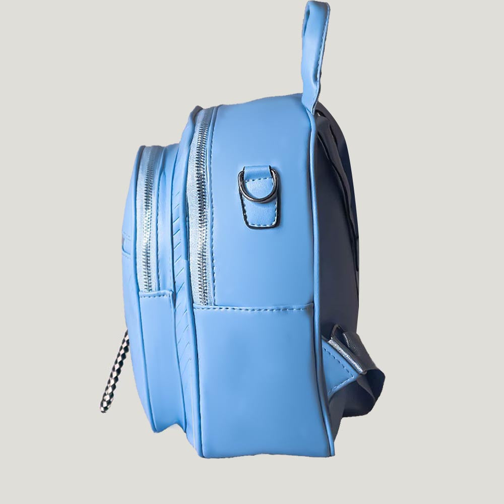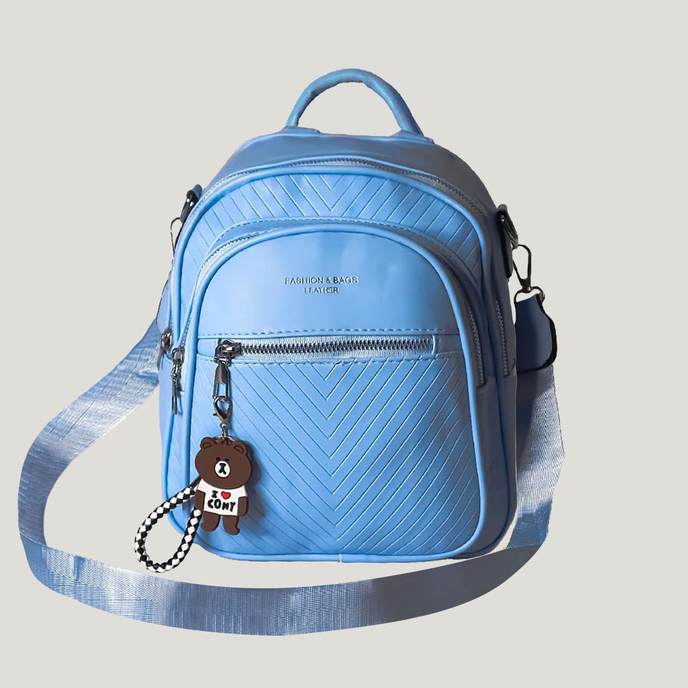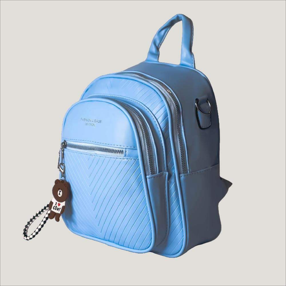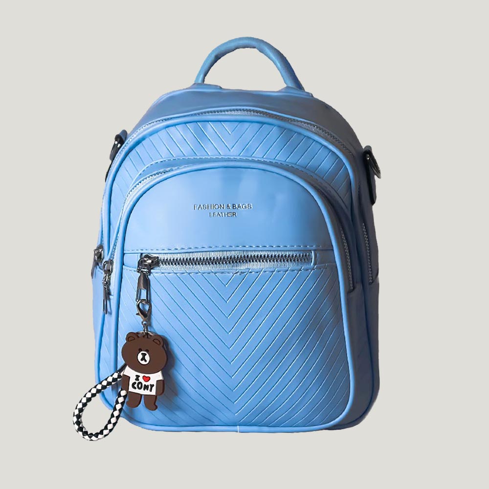 El Lumia en azul claro es un morral que destaca por su estilo fresco y divertido. Su textura frontal con patrón en V y el llavero de osito lo convierten en el compañero ideal para looks relajados o universitarios.